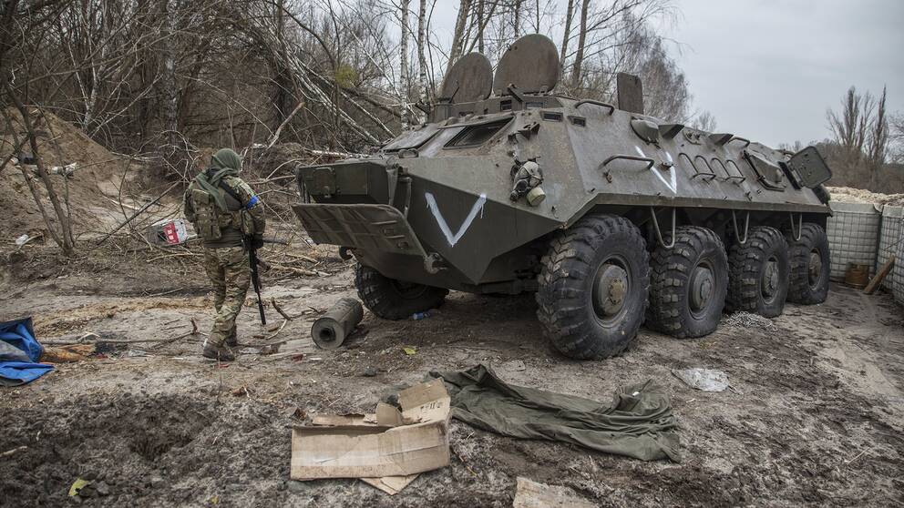 En ukrainsk soldat passerar ett övergivet ryskt pansarfordon i närheten av Tjernobyl.